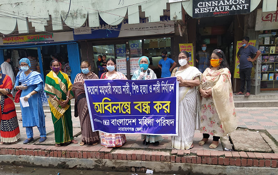 মহামারী করোনা পরিস্থিতির মাঝে শিশু হত্যা ও নারী নির্যাতনের প্রতিবাদে বৃষ্টি উপেক্ষা করে নারায়ণগঞ্জ জেলা শাখার মহিলা পরিষদের উদ্যোগে মানববন্ধ অনুষ্ঠিত হয়েছে।