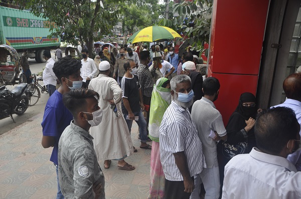 ক্ষোভে দূরত্ব না মেনেই ঘন্টার পর ঘন্টা লাইনে