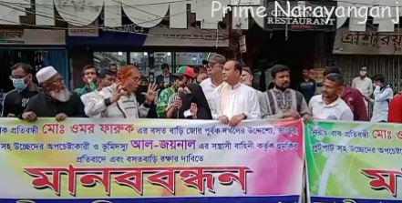 বাক প্রতিবন্ধি ওমর ফারুকের বসত বাড়ি জোরপূর্বক দখলের উদ্দেশ্য ভাংচুর, লুটপাটসহ উচ্ছেদের অপচেষ্টাকারি ও ভূমিদস্যু আল-জয়নালের সন্ত্রাসী বাহিনীর হুমকির প্রতিবাদে মানববন্ধন করেছে জাতীয় বধির সংঘ নারায়ণগঞ্জ জেলা শাখা।
