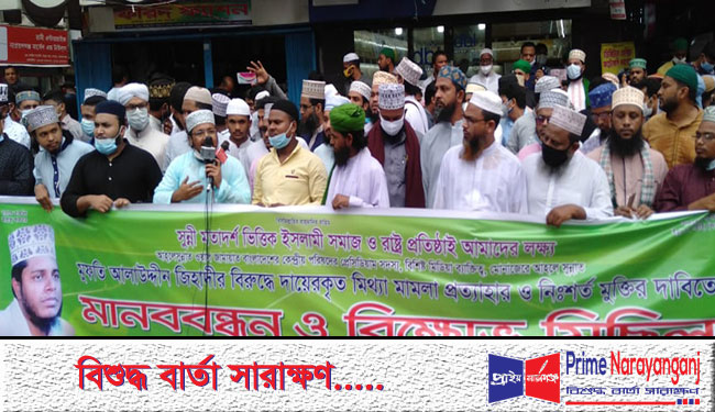 হেফাজতে ইসলামের আমির শাহ আহমদ শফির মৃত্যু নিয়ে ফেসবুকে কুটক্তি করায় আহলে সুন্নাত ওয়াল জামায়াতের উপদেষ্টা মুফতি আলাউদ্দিন জিহাদী গ্রেফাতারের প্রতিবাদে মানববন্ধন করেছে আহলে সুন্নাত ওয়াল জামায়াতের নারায়ণগঞ্জ শাখা।