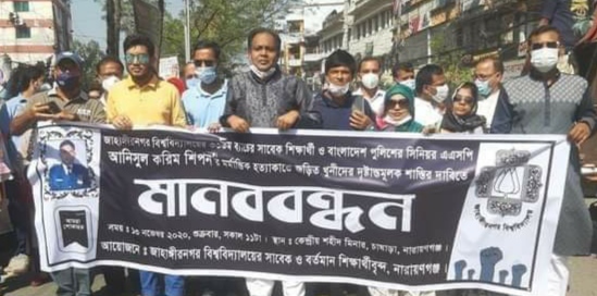 জাহাঙ্গীরনগর বিশ্ববিদ্যালয়ের ৩৩তম ব্যাচের সাবেক শিক্ষার্থী ও বাংলাদেশ পুলিশের সিনিয়র সহকারী পুলিশ সুপার (এএসপি) আনিসুল করিম শিপনের মর্মান্তিক হত্যাকান্ডে জড়িত খুনীদের দৃষ্টান্তমূলক শাস্তির দাবিতে মানববন্ধন কর্মসূচী পালিত হয়েছে।