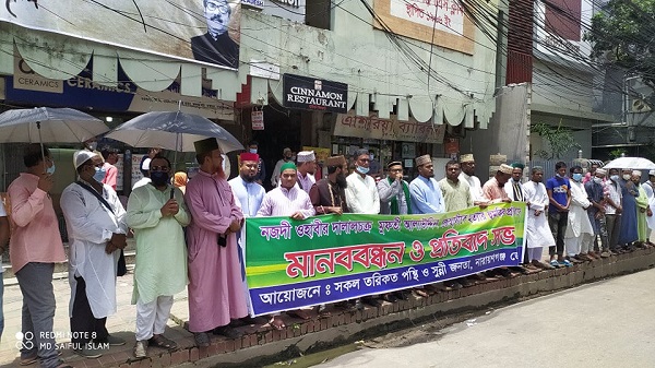 মুফতি আলাউদ্দিন জেহাদীকে হত্যার হুমকির প্রতিবাদে মানববন্ধন ও প্রতিবাদ সভা অনুষ্ঠিত হয়েছে। সকল তরিকত পন্থী ও সুন্নী জনতার ব্যানারে শনিবার (০৮ আগষ্ট) সকালে নারায়ণগঞ্জ প্রেসক্লাবের সামনে এ মানববন্ধন অনুষ্ঠিত হয়।